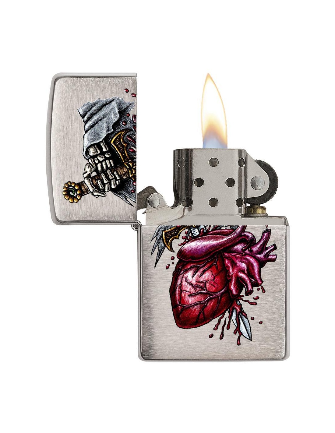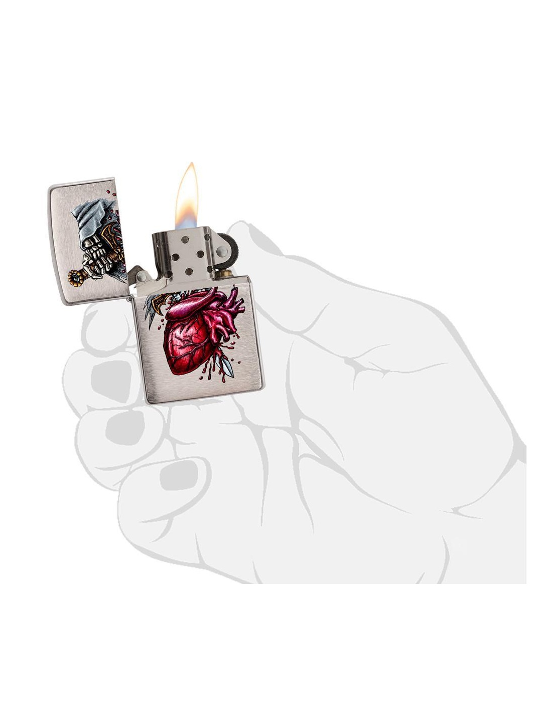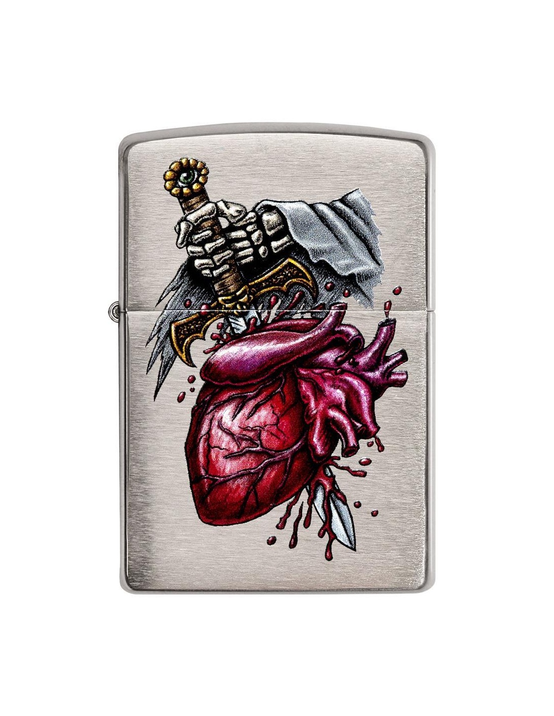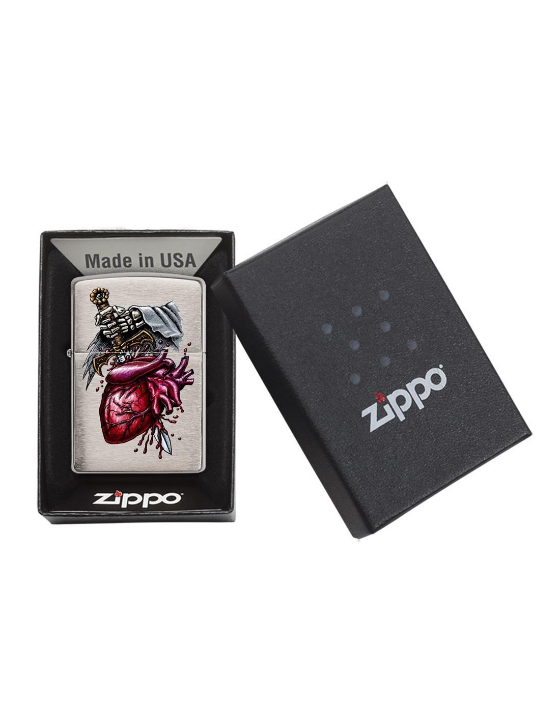 Zapalniczka Zippo 29406 Dagger Through Heart to produkt wyprodukowany w USA przez słynną firmę Zippo Manufacturing Company w Bradford w Pensylwanii. Zapalniczki Zippo stały się szczególnie popularne w czasie II wojny światowej, kiedy były produkowane wyłącznie dla armii USA, a dziś zapalniczka Zippo jest częścią standardowego wyposażenia amerykańskiego żołnierza. W latach 60. fani na koncertach zaczęli podnosić i zapalać zapalniczki Zippo, aby witać artystów na scenie, gest zwany „momentem Zippo”. Zapalniczki Zippo są wielokrotnego napełniania, trwałe i lekkie nawet w niesprzyjających warunkach wietrznych. Dziś zapalniczki Zippo są sprzedawane w ponad 100 krajach i stały się przedmiotami kolekcjonerskimi dla wielu entuzjastycznych kolekcjonerów.