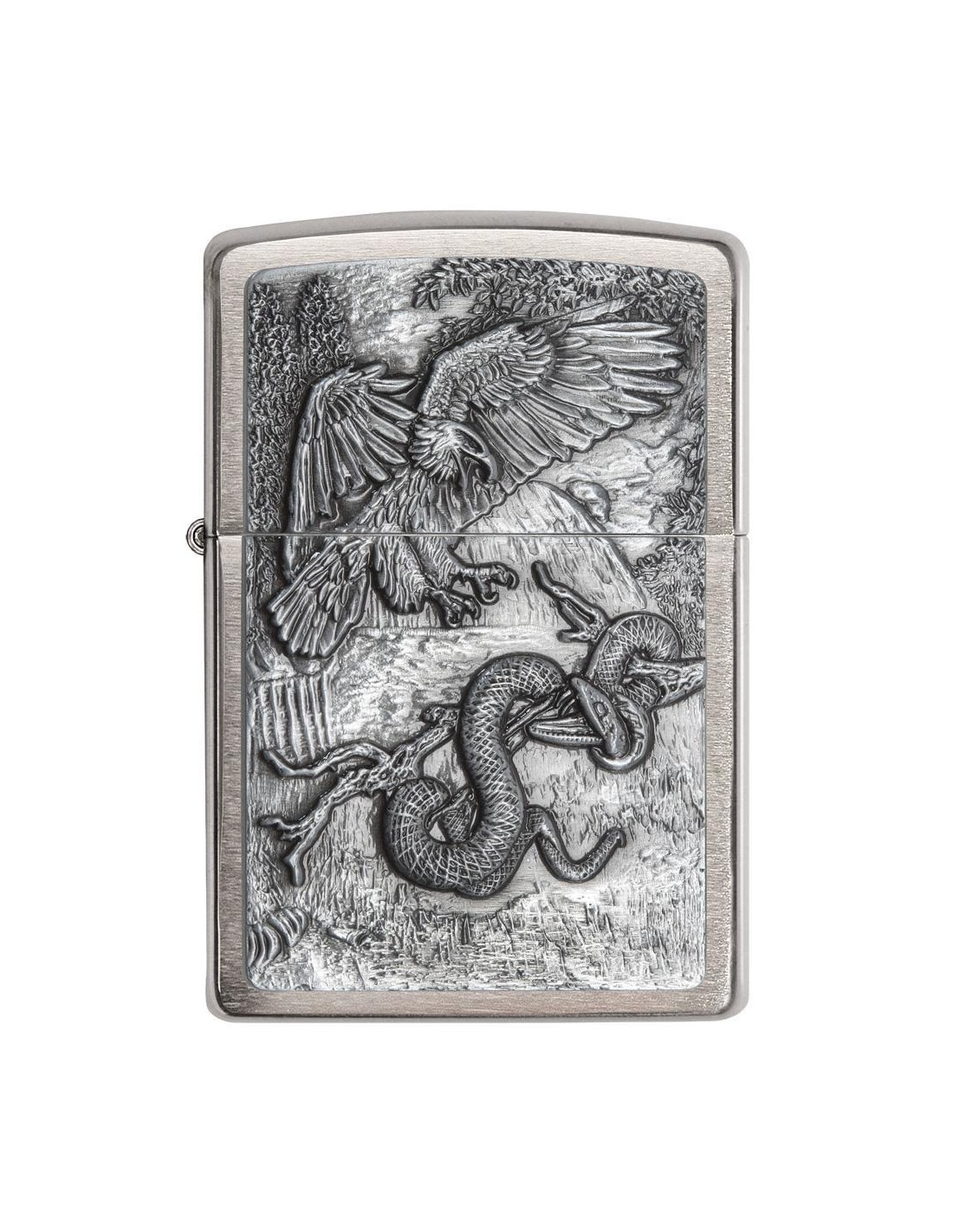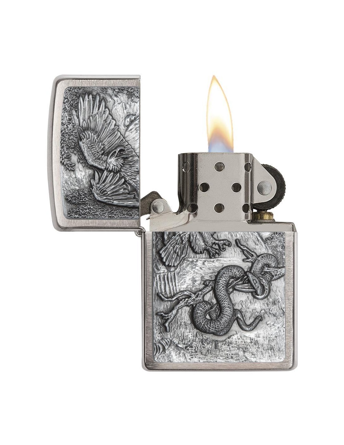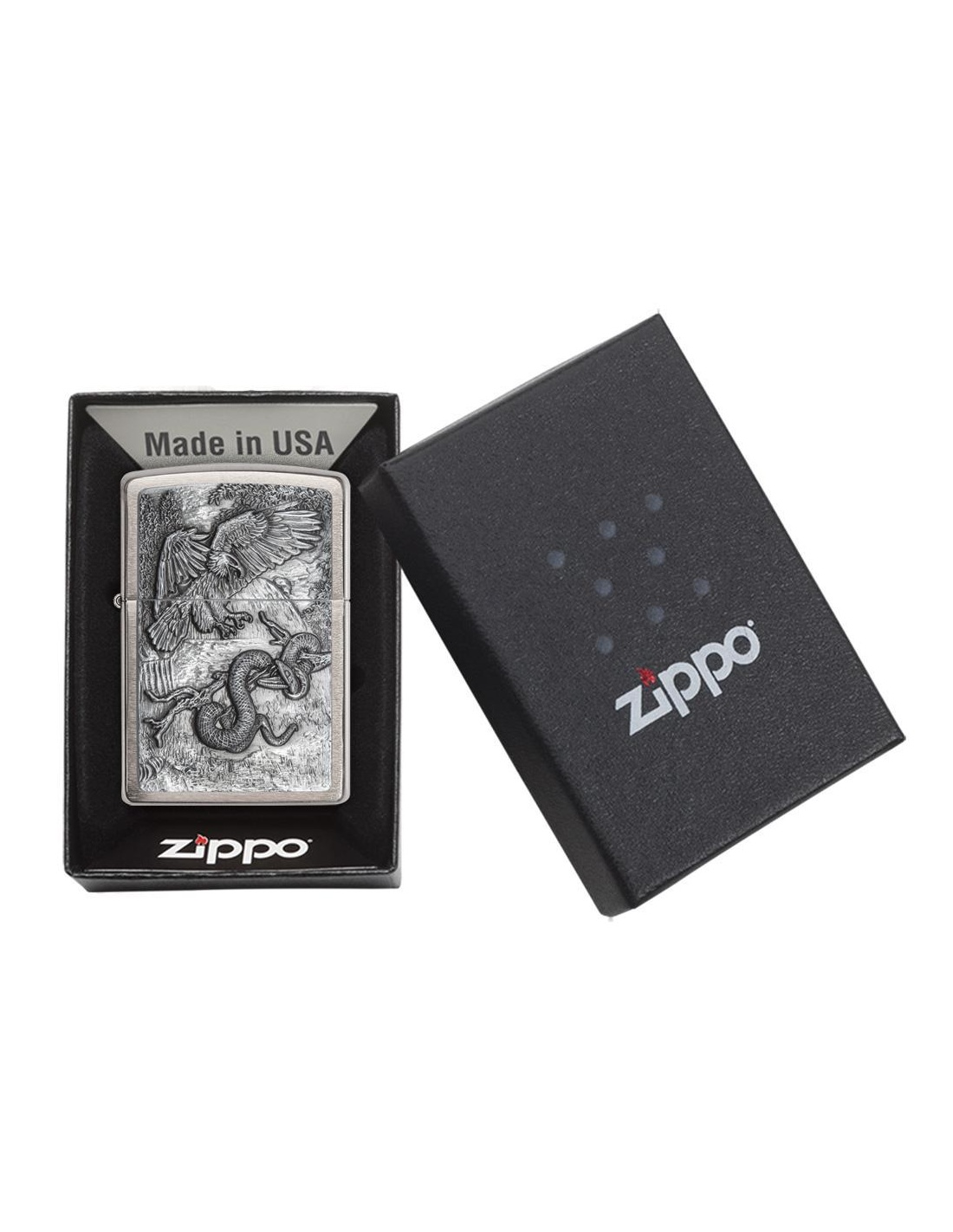 Zapalniczka Zippo 29637 Eagle vs. Snake to produkt wyprodukowany w USA przez słynną firmę Zippo Manufacturing Company w Bradford w Pensylwanii. Zapalniczki Zippo stały się szczególnie popularne w czasie II wojny światowej, kiedy były produkowane wyłącznie dla armii USA, a dziś zapalniczka Zippo jest częścią standardowego wyposażenia amerykańskiego żołnierza. W latach 60. fani na koncertach zaczęli podnosić i zapalać zapalniczki Zippo, aby witać artystów na scenie, gest zwany „momentem Zippo”. Zapalniczki Zippo są wielokrotnego napełniania, trwałe i lekkie nawet w niesprzyjających warunkach wietrznych. Dziś zapalniczki Zippo są sprzedawane w ponad 100 krajach i stały się przedmiotami kolekcjonerskimi dla wielu entuzjastycznych kolekcjonerów.