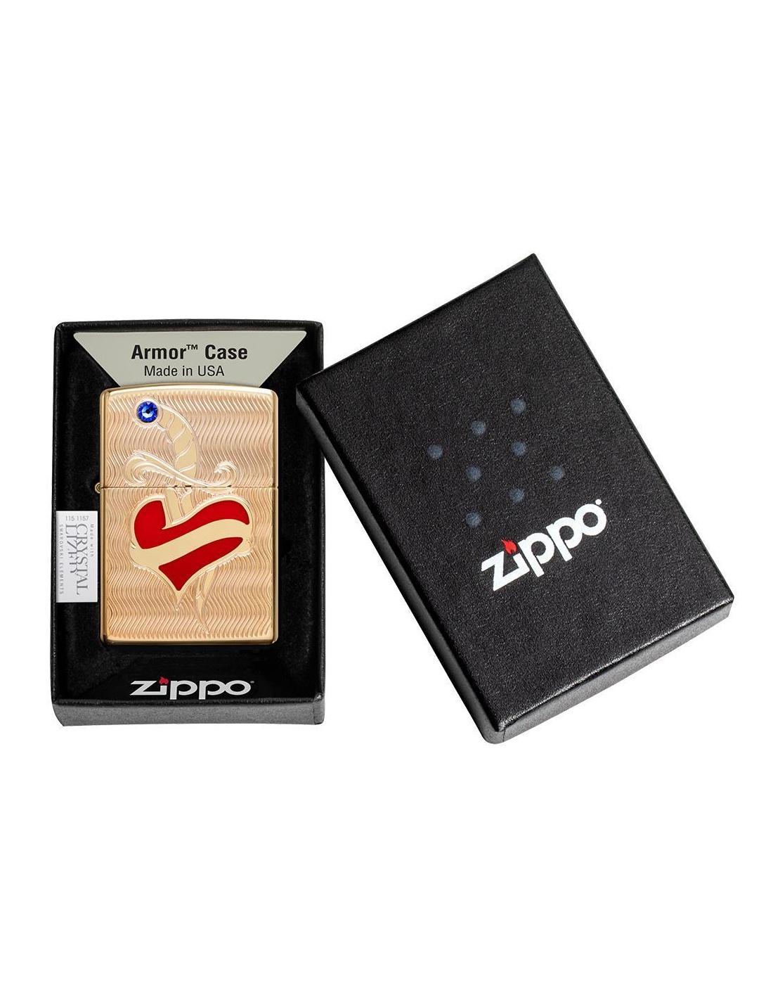 Zapalniczka Zippo 49303 Armor Heart and Sword to produkt wyprodukowany w USA przez słynną firmę Zippo Manufacturing Company w Bradford w Pensylwanii. Zapalniczki Zippo stały się szczególnie popularne w czasie II wojny światowej, kiedy były produkowane wyłącznie dla armii USA, a dziś zapalniczka Zippo jest częścią standardowego wyposażenia amerykańskiego żołnierza. W latach 60. fani na koncertach zaczęli podnosić i zapalać zapalniczki Zippo, aby witać artystów na scenie, gest zwany „momentem Zippo”. Zapalniczki Zippo są wielokrotnego napełniania, trwałe i lekkie nawet w niesprzyjających warunkach wietrznych. Dziś zapalniczki Zippo są sprzedawane w ponad 100 krajach i stały się przedmiotami kolekcjonerskimi dla wielu entuzjastycznych kolekcjonerów.