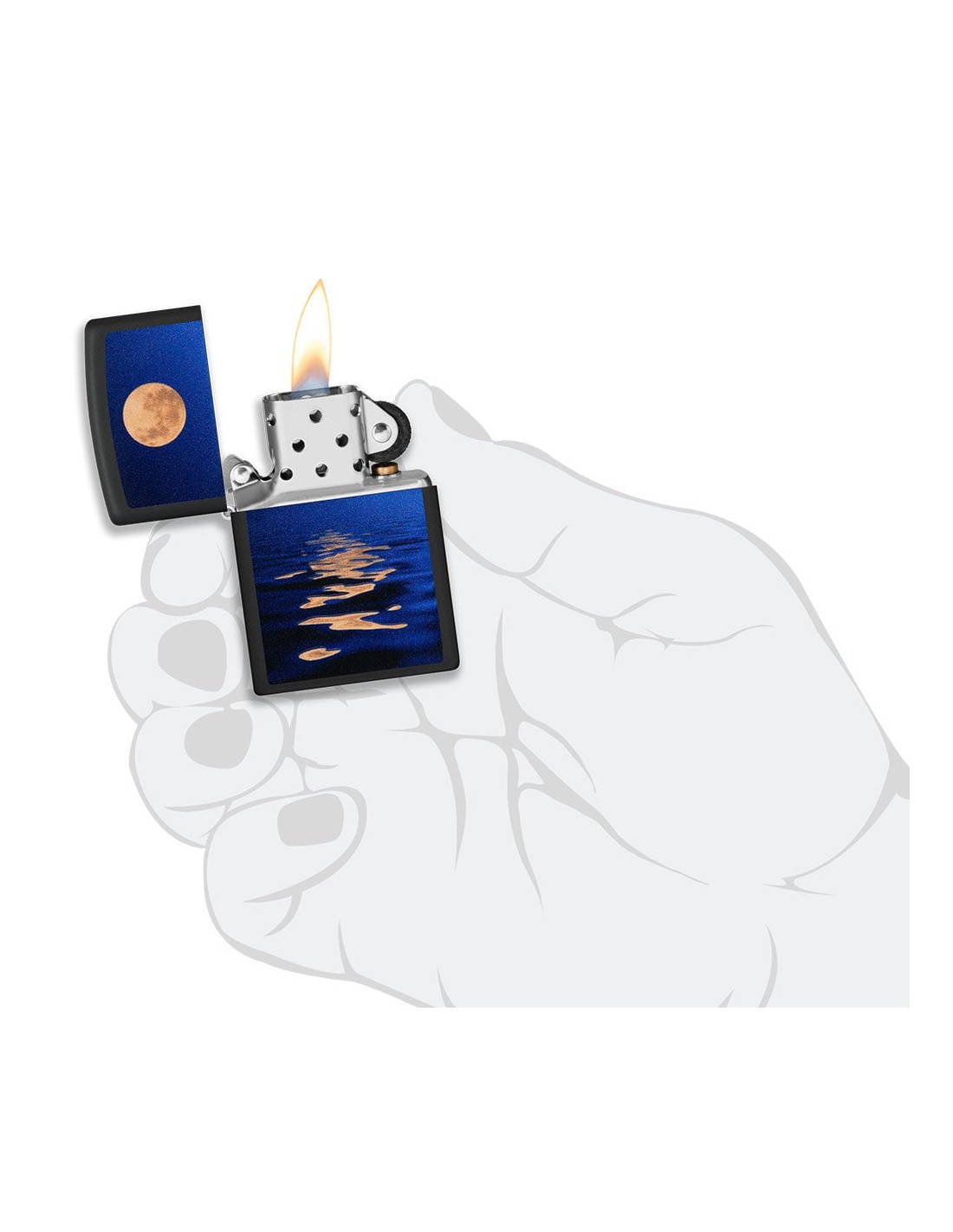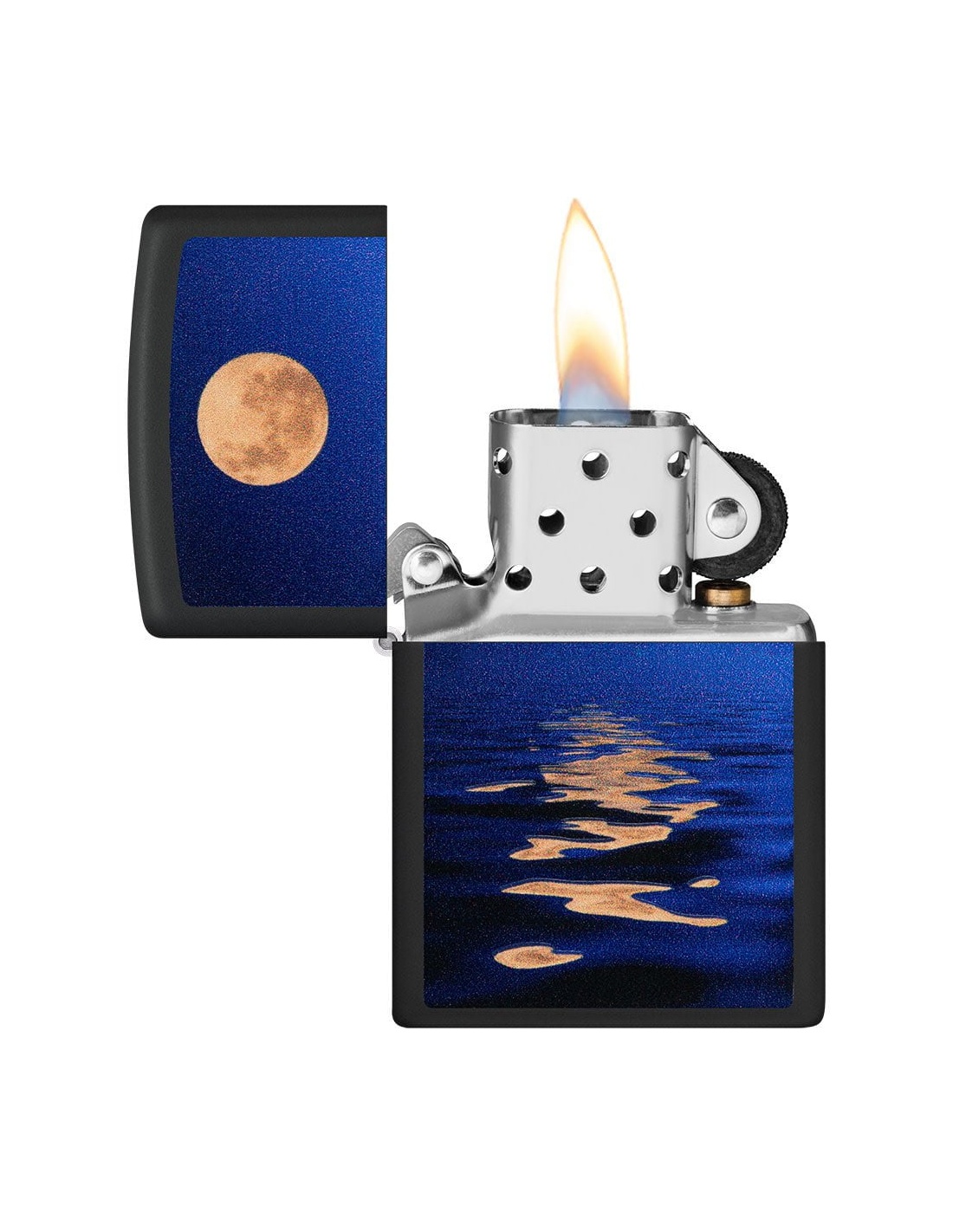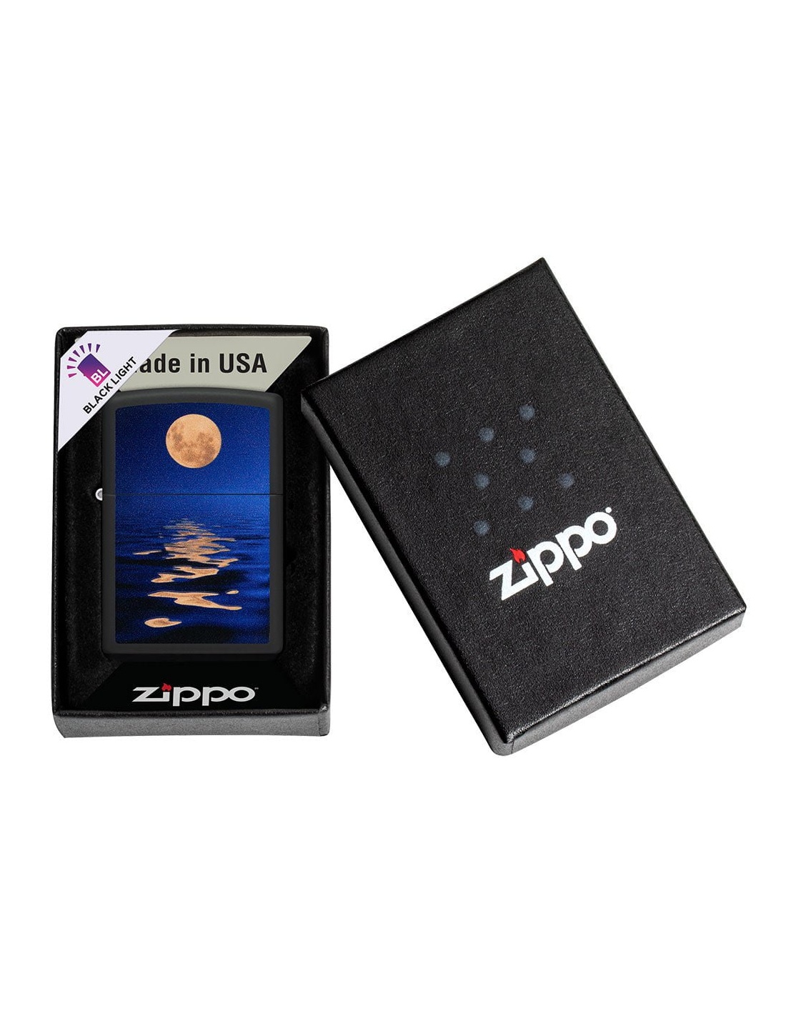 Zapalniczka Zippo 49810 Black Light Full Moon and Sea to produkt wyprodukowany w USA przez słynną firmę Zippo Manufacturing Company w Bradford w Pensylwanii. Zapalniczki Zippo stały się szczególnie popularne w czasie II wojny światowej, kiedy były produkowane wyłącznie dla armii USA, a dziś zapalniczka Zippo jest częścią standardowego wyposażenia amerykańskiego żołnierza. W latach 60. fani na koncertach zaczęli podnosić i zapalać zapalniczki Zippo, aby witać artystów na scenie, gest zwany „momentem Zippo”. Zapalniczki Zippo są wielokrotnego napełniania, trwałe i lekkie nawet w niesprzyjających warunkach wietrznych. Dziś zapalniczki Zippo są sprzedawane w ponad 100 krajach i stały się przedmiotami kolekcjonerskimi dla wielu entuzjastycznych kolekcjonerów.
